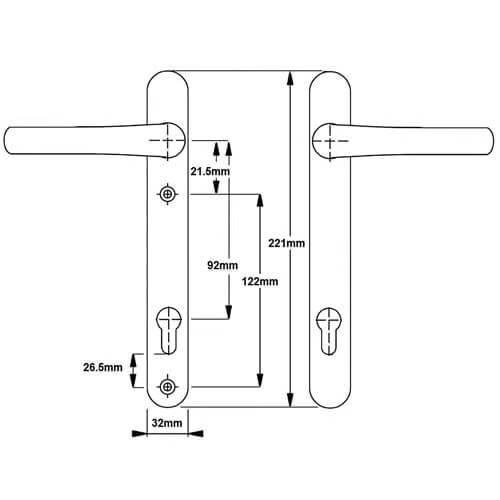 From the Era Classic range, these handles have sprung 92pz internal & external lever handles and with a backplate of 220mm x 32mm they are available in various finishes. The distance between the fixing screws is 122mm with the bottom screw positioned 27mm below the keyway. They are supplied as a pair complete with fixings consisting of spindle, spring cassettes & colour co-ordinated screws.