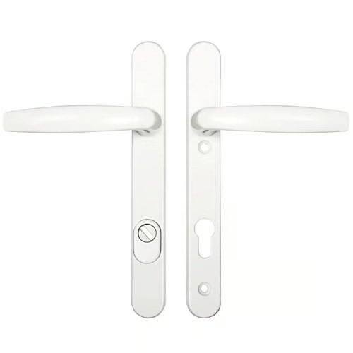 These Hoppe handles from the Atlanta range have an enhanced security standard which has been tested and proven to PAS 24. The external handle features a hardened steel cylinder cover for cylinder projection of 10-18mm. With sprung 92pz internal & external levers and a backplate size of 240mm x 35mm they are available in various finishes. The distance between the fixing screws is 122mm with the bottom screw positioned 26mm below the euro profile cut-out. They are supplied as a pair complete with spring cassettes, an 8mm square spindle & 2 colour co-ordinated bolt through M6 screws and an M10 security fixing bolt to suit door thickness 70mm.