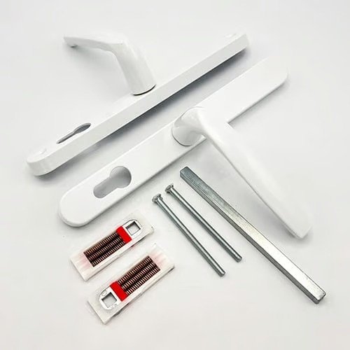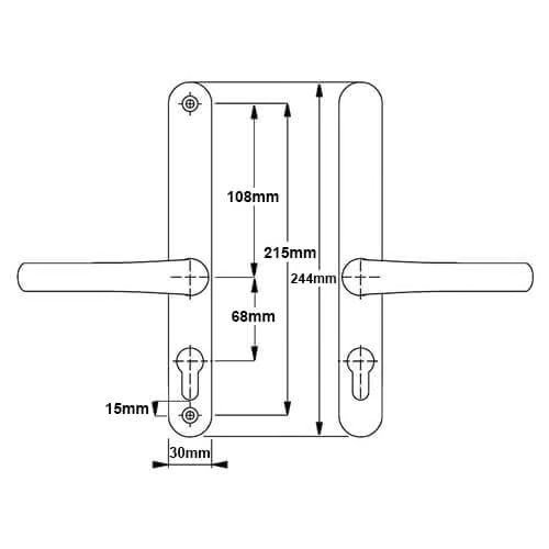 This Hoppe UPVC lever lever multipoint door lock handle from the Brugge* range suit Fullex SL16 multipoint locks with 68pz centres. They have sprung internal and external levers on a backplate of 244mm x 30mm which is available in various