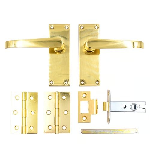 A door pack containing the essential hardware to latch, hang and open an internal door Includes a set of straight lever latch handles, a 63mm mortice latch and a pair of 75mm hinges with screws.