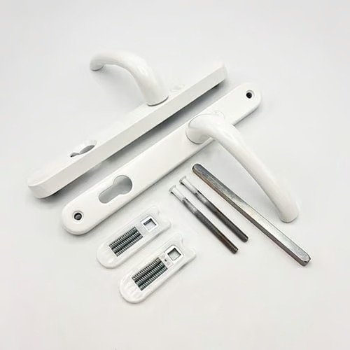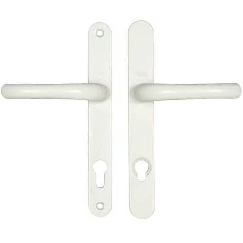 The Yale MK3 high security door handle with built in cylinder guard has sprung 92pz levers on a backplate 245mm x 34mm. Durability tested to 200,000 cycles and corrosion resistant tested to 480 hours they are availble in polished chrome and white finishes.